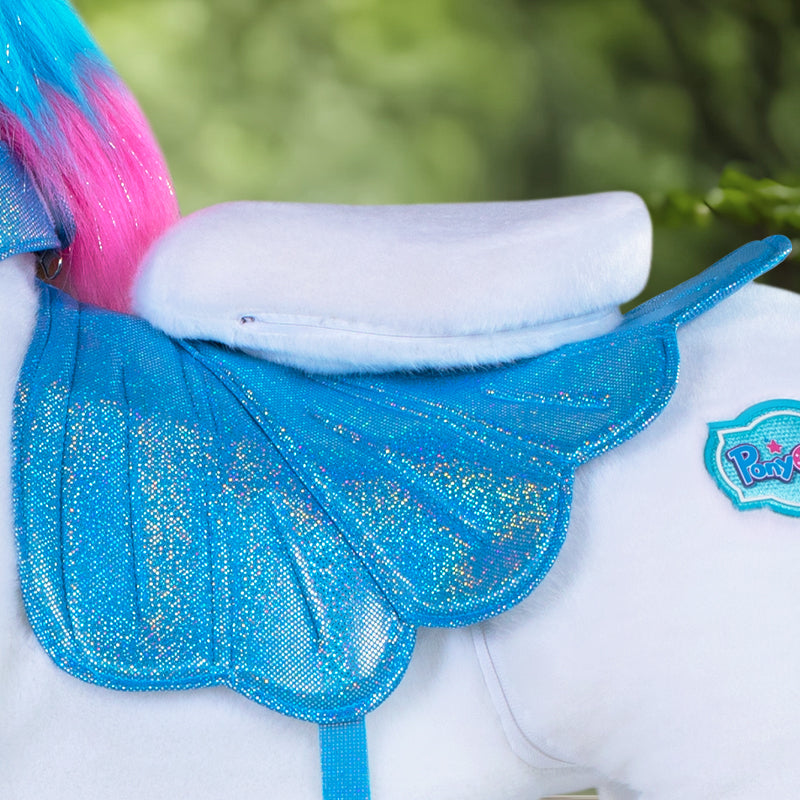 Les quartiers de la selle sont confectionnés dans un tissu scintillant. Leur design en forme d'aile rehausse l'allure générale et ajoute mouvement et dynamisme à la selle. Il évoque la puissance de la licorne volante mythique.